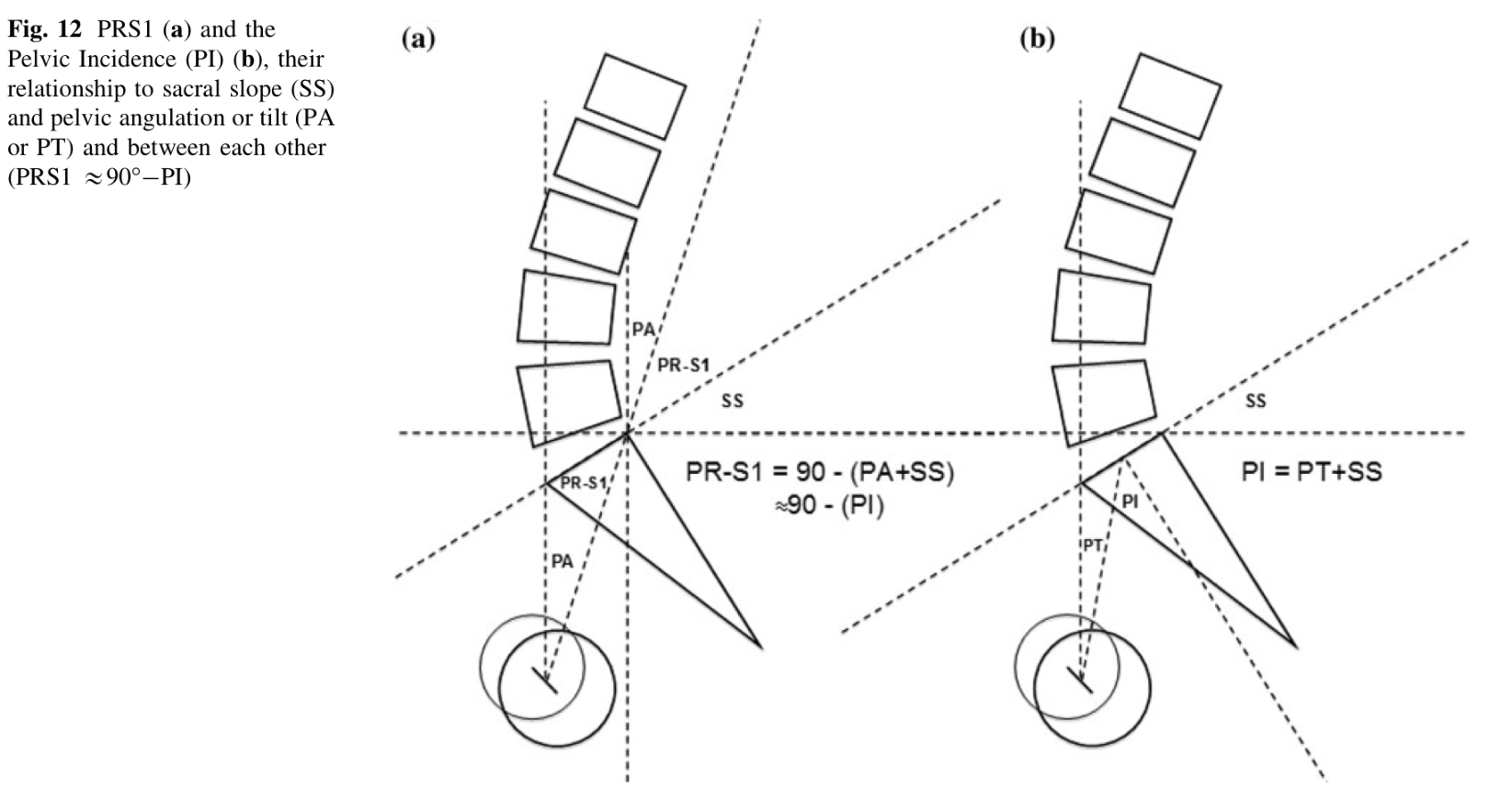 PRS1 각도는 이전 연구에서 요추 전만과 높은 상관관계가 있는 것으로 보고되었습니다. PRS1 각도가 변경됨에 따라 상응하는 변화가 요추 전만에서 기록됩니다. PR과 T12 사이에 형성된 각도인 PR-T12는 골반 형태와 요추 전만, 이것은 표준 측면 요추 X-RAY 사진 에서 요추-골반 시상면 균형을 신속하게 평가하는 간단한 방법을 제공합니다.