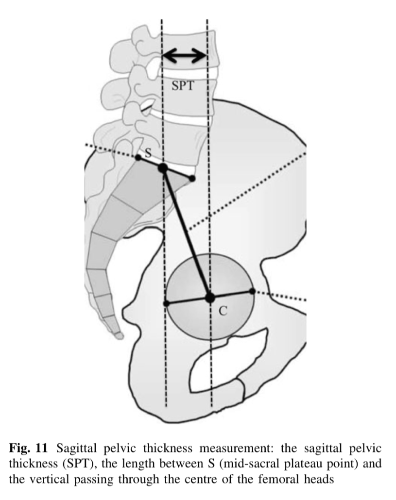 매우 낮은 Pelvic incidence(PI)를 가진 환자는 anterior-posterior(AP)가 매우 짧은 골반 고리가 있는 것을 나타냅니다. 이것은 골반이 수직임을 나타냅니다. 이 골반은 수평으로 좁고 수직으로 강합니다. 대퇴골두는 천골판 바로 아래에 있습니다. 반대로 PI가 높은 골반은 AP 축이 큽니다. 시상면에서 대퇴골두는 천골판의 중간 지점 앞에 배치됩니다. 마지막으로, PI가 매우 낮은 환자에서 인간의 골반 형태는 큰 영장류의 골반에 가깝습니다. 수직 형태는 수직성에 덜 적응합니다. 이런 식으로 수직 골반은 천골 경사(sacral slope, SS)가 낮기 때문에 골반이 기울어지는 능력이 낮습니다. 반대로 수평 골반은 SS가 높고 후굴 가능성이 높습니다.