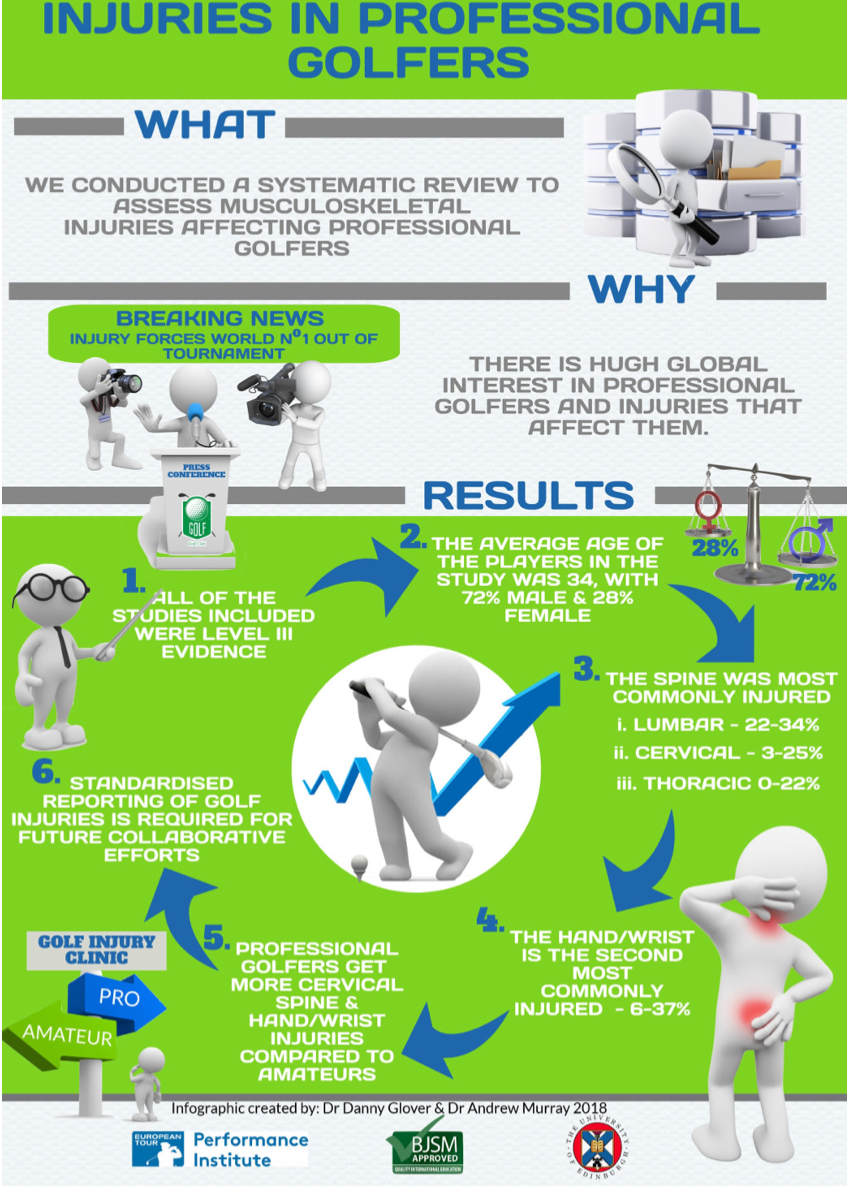 손 / 손목은 전체적인 척추 부상을 제외하고 신체에서 두 번째로 가장 흔한 부상 부위였습니다. 가장 흔한 부상 부위에 대한 지식이 중요하지만, 부상이 골퍼의 퍼포먼스에 미치는 영향에 대한 지식도 마찬가지로 필요합니다. 선수들에게 부상은 대회를 진행하지 못하는 변수로 작용합니다. 최근에는 부상 심각도에 대한 정확한 설명으로 'injury burden(상해의 부담)'을 활용하도록 권장했습니다.