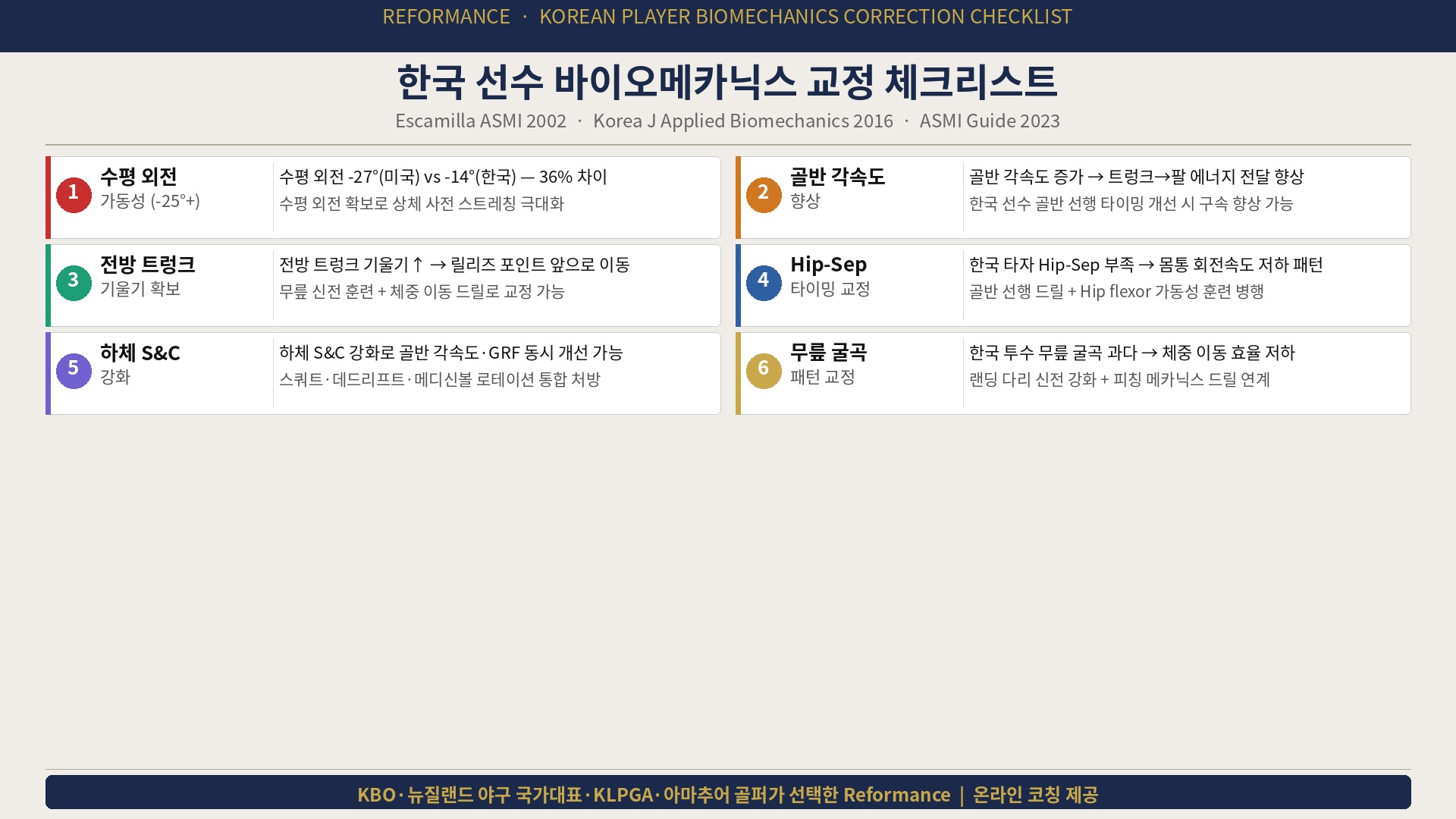 수평 외전 가동성, 골반 각속도, 전방 트렁크 기울기 — 이 세 가지가 한국 선수 코칭의 핵심 출발점입니다.