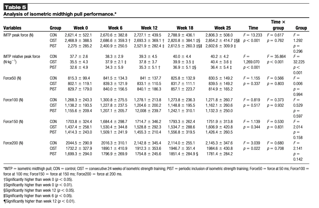 이후, 선수들은 무작위로 대조군(CON= control), CIST 또는 PIST 그룹에 배정되었습니다. 등척성 스쿼트는 전체 24주 훈련 기간 동안 CIST 훈련 프로그램에 포함되었습니다. PIST 그룹에서 등척성 스쿼트를 매 6주 훈련 후 6주 동안만 수행되었다. CON은 24주 동안 등척성 스쿼트를 수행하지 않았습니다.