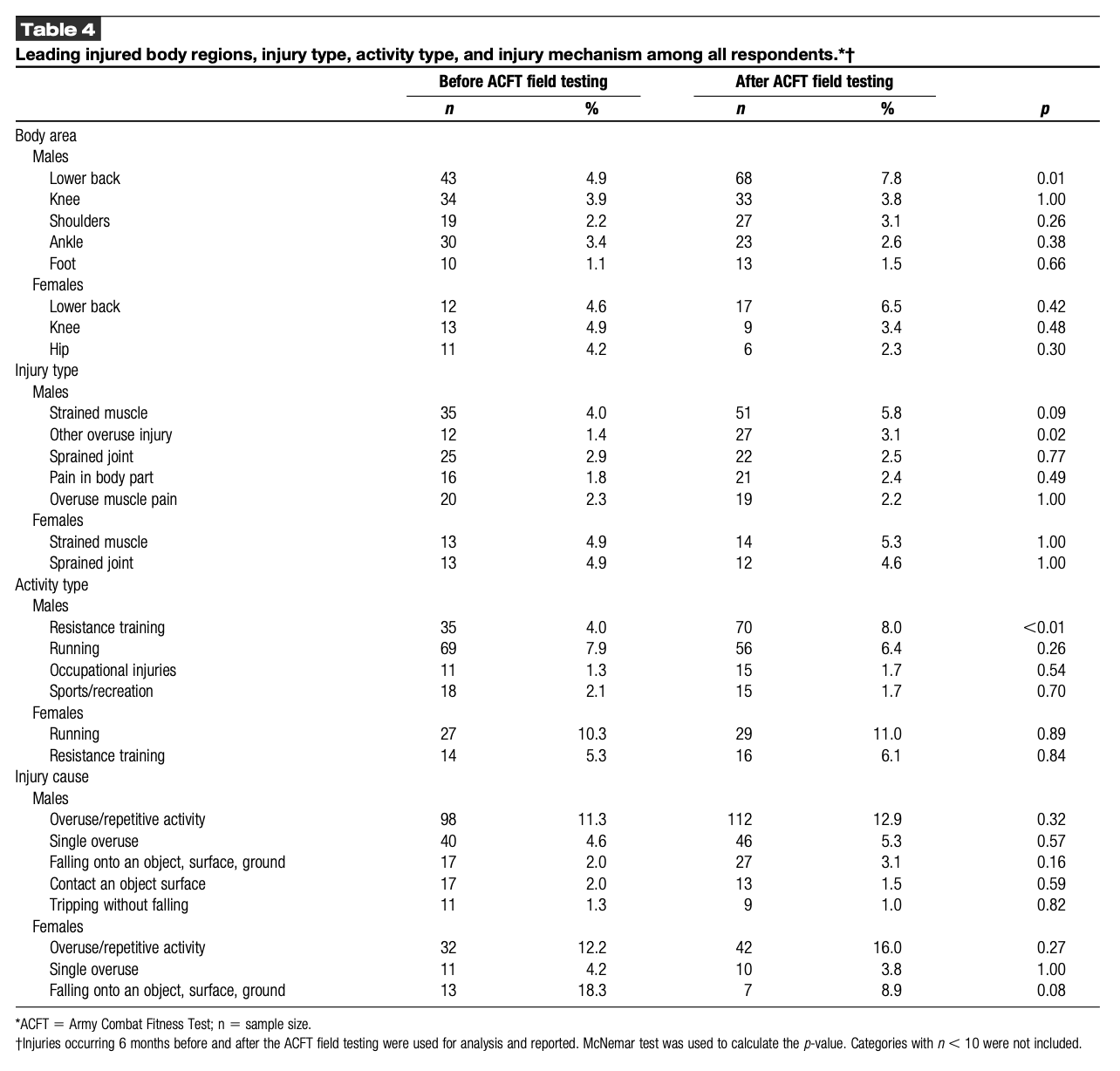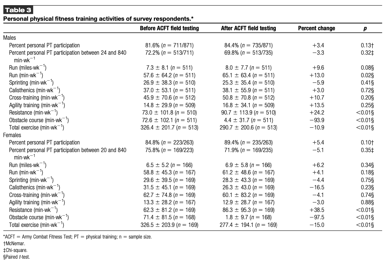 그래서 2012년부터 준비해온 ACFT가 2018~2020년 필드 테스트로 실시되었고, 이 과정에서 실제 훈련 내용, 빈도, 종류가 어떻게 바뀌었는지 그리고 이 변화가 부상률 증가와 어떤 연관이 있었는지가 본 논문의 핵심 분석 내용입니다.