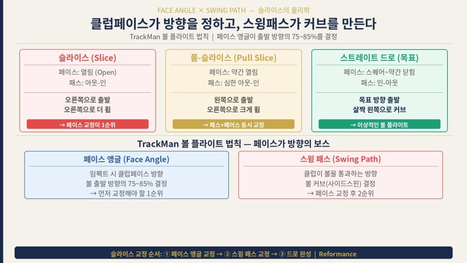 TrackMan 데이터 분석에 따르면, 슬라이스는 스윙패스 문제보다 클럽페이스 문제가 1순위 원인입니다. 클럽패스가 완벽히 중립이어도 페이스가 열려 있으면 슬라이스가 납니다.