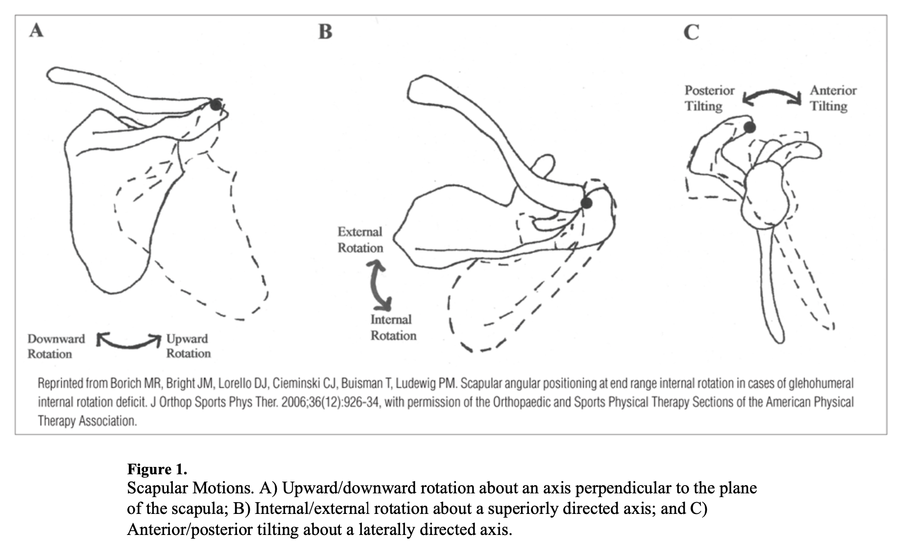 어깨의 정상적인 움직임은 팔을 들어 올리는 동안 견갑골이 위쪽(upward)으로 회전(rotation)하고 뒤쪽(posterior)으로 기울어(tilt) 져야 한다고 설명되어 있습니다. 견갑골(scapula)의 내회전(internal rotation) 또는 외회전(external rotation)은 상승(elevation)과 가동범위는 흉부에서 더 가변적입니다. 상완골 거상(elevation) 가동범위 끝(range of motion end point)에는 견갑골 외회전(external rotation)이 포함됩니다.