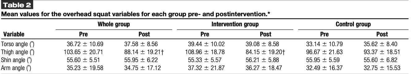 개입 그룹은 8주 프로그램 후 OHS 허벅지 각도에서 상당한 감소를 달성했습니다(즉, 골퍼는 더 낮은 스쿼트 자세를 얻었습니다)(표2).