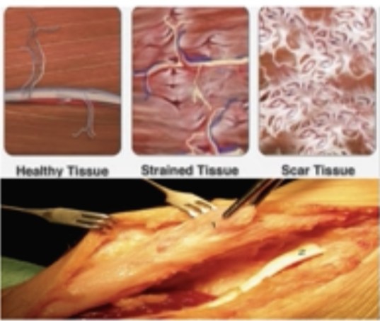 손상을 당했을 때 조직은 크게 Healthy tissue(건전 조직), strained tissue(변형 조직), scar tissue(반흔 조직) 이렇게 3가지로 나뉩니다. 조직의 배열뿐만 아니라 scar tissue(반흔 조직)의 과다 생성으로 인해 Adhesion(유착)이 심해집니다. Adhesion(유착)은 다른 조직과 서로 엉켜 붙은 것입니다. 이때 해부를 하여 조직을 보게 되면 조직이 매우 두꺼워져 있음을 볼 수 있습니다. 조직이 두꺼워진 것은 좋아진 것이 아닌 scar tissue(반흔 조직)가 많이 생성된 겁입니다. 이것은 만성 손상, 불안정성을 만들게 되며 2차적인 다른 부상으로 이어질 수 있습니다.