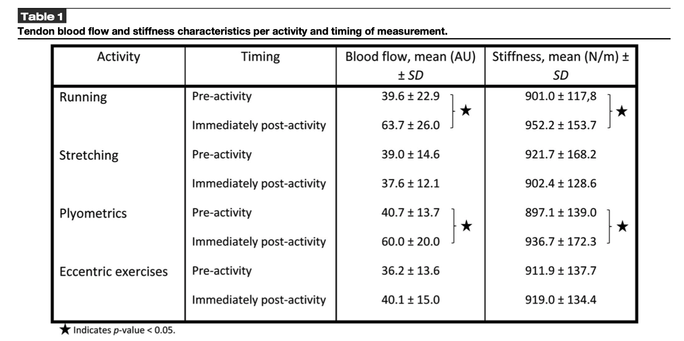 이 연구의 결과는 달리기와 플라이오메트릭이 힘줄의 혈류 및 stiffness를 크게 증가 시켰지만 스트레칭과 편심성 운동은 그렇제 않았다는 것을 보여주었습니다.