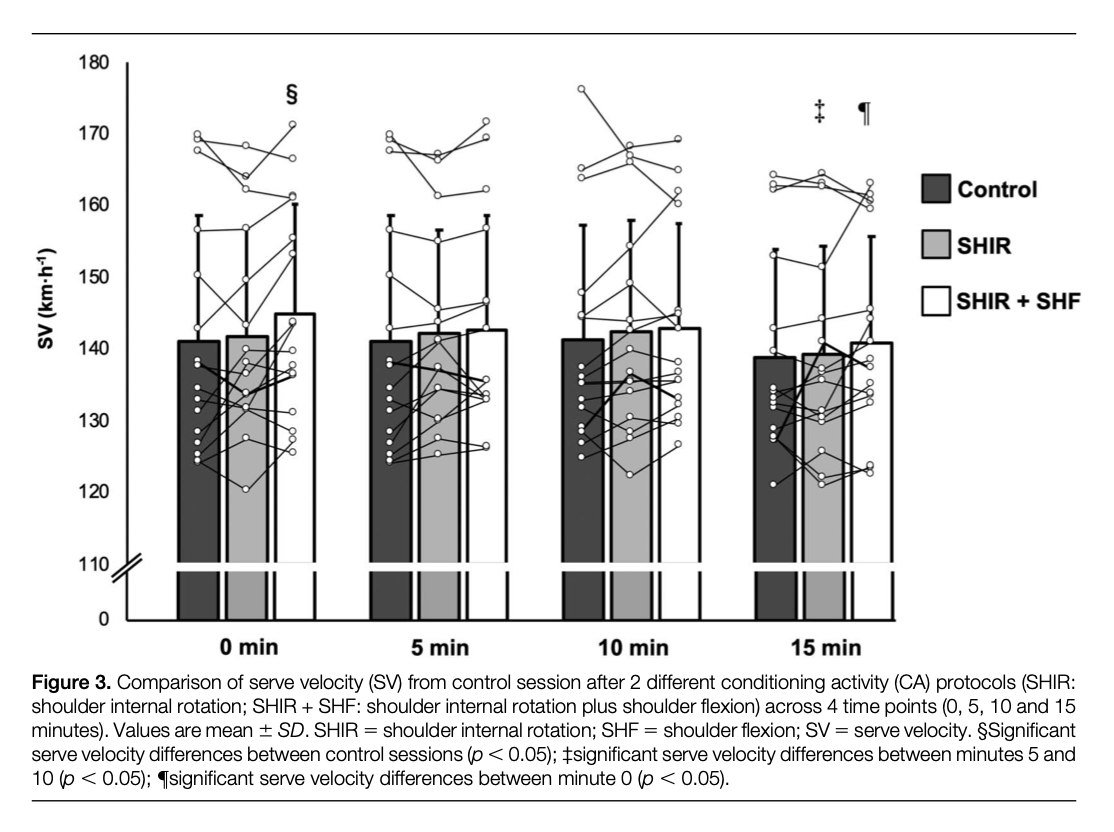 이 연구의 주요 발견은 서브 키네틱 체인과 관련된 운동이 PAPE를 즉시 유도하여 젊은 테니스 선수에서 serve accuracy(SA) 손상 없이 SV를 증가시킨다는 것입니다. 결과는 PAPE가 2개의 MVIC CA 연습 후 SA 손상 없이 SV를 증가시켰다는 것을 보여주었습니다. 관찰된 PAPE가 사용된 테니스 관련 maximal vliuntary isometric contraction(MVIC) 운동의 효과로 서브 스피드 향상을 얻을 수 있다는 가설을 세울 수 있습니다. 어깨 내부 회전 및 SHF는 테니스 라켓이 공을 향해 가속하는 주요 원인 중 하나인 서브 운동 사슬에 관여합니다. 연구 결과와는 달리, CA 운동이 고강도(최대 1회 반복[1RM]의 80%에서 3회 반복) 전통적인 저항 운동(하프 스쿼트 및 벤치 프레스) 동안 수행되었을 때 SV에 PAPE가 없었습니다. 더욱이, 탄도 운동(즉, 웨이트 점프 또는 역도 변형)이 PAPE를 유발하는 것으로 나타났음에도 불구하고, 젊은 테니스 선수에서 CA로 가벼운 하중(200 및 600g 공) 던지기를 사용하여 PAPE가 증가함에도 트레이닝을 하지 않는 것으로 관찰됩니다. 주목할 점은 서브가 스트레치-쇼트닝 사이클(SSC)을 포함하고 사용된 CA 프로토콜이 등척성 수축을 포함하지만 즉각적인 PAPE 효과는 SSC를 최적화하는 것으로 보입니다. 이전 연구는 또한 SSC 이전의 MVIC 운동(예: 점프 또는 스프린트)의 긍정적인 PAPE 효과를 발견했습니다.