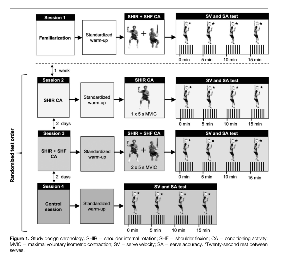 활성화 후 성능 향상 postactivation performance enhancement (PAPE)의 효과가 느린 움직임이나 등척성 수축보다 빠른 탄도에 대해 더 높다는 점을 고려하면 serve velocity(SV)는 유익한 효과를 얻을 수 있습니다. 활성화 후 성능 향상은 이전에 주로 힘 발달 속도(RFD)와 파워를 개선하기 위한 점프, 던지기, 전력 질주 또는 상체 탄도 운동과 같은 폭발적인 스포츠 동작에 효과를 나타냈습니다. PAPE 연구는 높은 수준의 기능을 향상시키기 위해 선택된 conditioning activities CA 운동(예: 저항, 탄도, 플라이오메트릭, 탄성 밴드) 및 수축성(등척, 동심 및 편심)에 중점을 두었습니다. 가장 많이 사용되는 동심, 다중 관절, 전통적인 저항 운동과 함께 속도 스포츠 특정 동작을 진행합니다. 서브 PAPE와 관련하여 문헌은 무거운 부하의 전통적인 저항 CA(예: 벤치 프레스 및 하프 스쿼트)를 사용하는 것이 젊은 테니스 선수의 SV를 향상시키지 않는다고 합니다.
