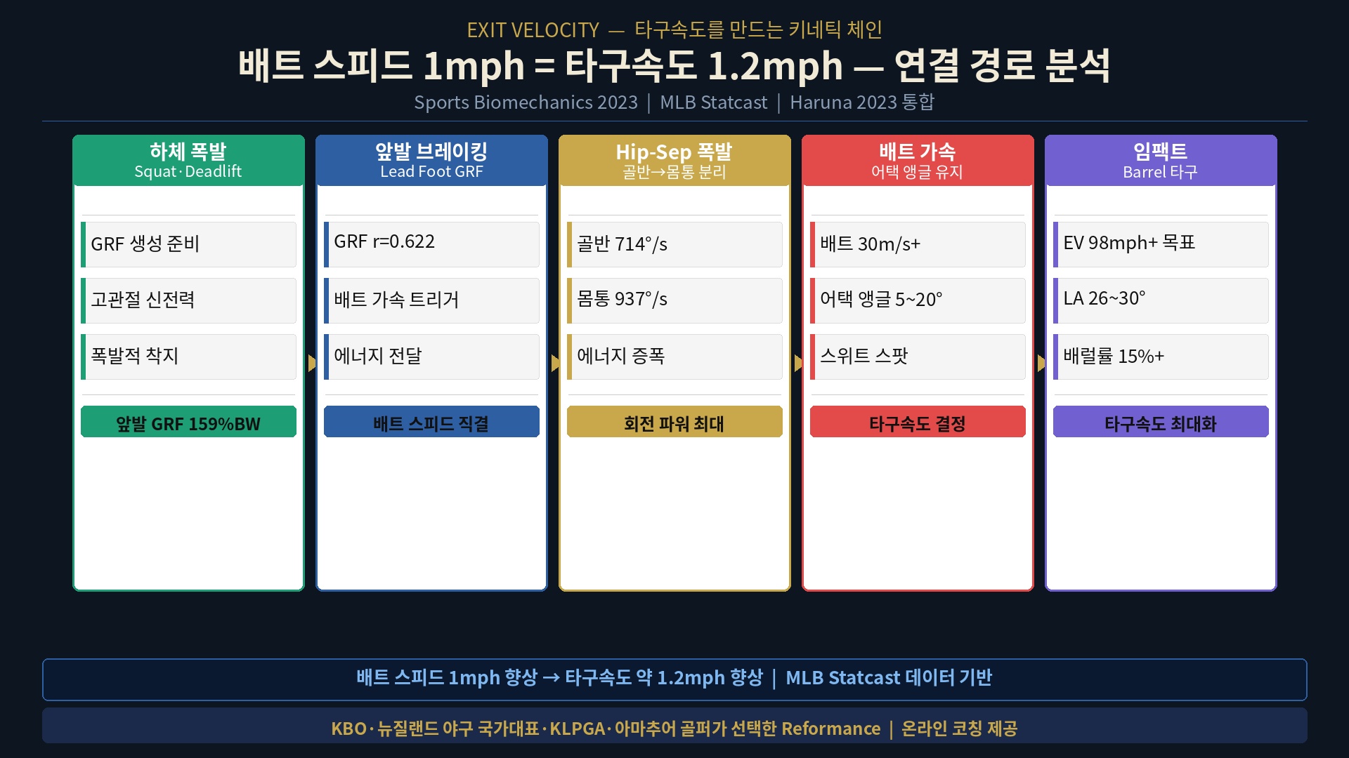 Sports Biomechanics 2023 연구에서 앞발 수직 지면반력과 배트 스피드 사이에 r=0.622(P=0.001)의 강한 상관관계가 확인됐습니다. PubMed 앞발이 착지하면서 지면을 강하게 밀어내야 그 힘이 배트 끝까지 전달됩니다. 하체 훈련 없이 스윙 반복만으로는 타구속도의 한계가 생깁니다.