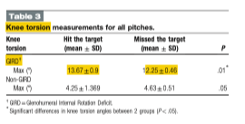 그러나 고등학교 1학년(16~18세)의 어깨 내회전 결핍(GIRD)을 가진 투수들은 목표물을 맞추기 위해 패스트볼로 타깃을 조정할 수 있는 것으로 보입니다. Chenget al(2011)의 연구 결과는 투구 중 어깨 내회전 결핍(GIRD)이 있는 투수의 몸통에서 보상 움직임이 있을 수 있음을 암시했습니다. 본 연구에서 Table 3의 결과는 어깨 내회전 결핍(GIRD)이 있는 투수가 목표 미스 투구보다 성공적인 투구에서 더 큰 무릎 비틀림이 관찰되었음을 보여줍니다.