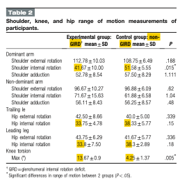 연구한 투수 그룹에 대한 조사는 동일한 투수 양쪽에서 고관절 관절 가동범위(ROM)에서 유의미한 차이를 나타내지 않았습니다. 그러나 GIRD가 있는 투수는 대조군보다 앞다리의 고관절 외회전이 유의하게 더 크게 나타났으며, 양쪽 고관절의 각도도 더 컸습니다.
