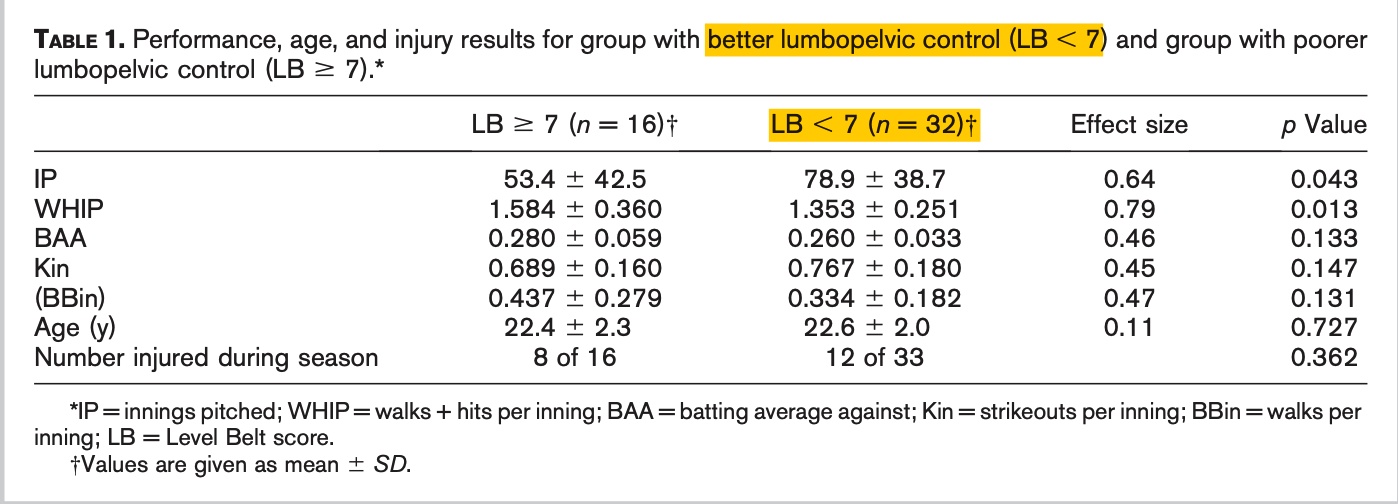 요추 골반 조절이 부족한 그룹보다 요추 골반 조절이 우수한 그룹에서 이닝당 볼넷과 피안타 수가 훨씬 더 낮았습니다. 요추 골반 조절 능력이 뛰어난 그룹은 평균적으로 훨씬 더 많은 이닝을 소화했습니다. 두 그룹 간에 부상 및 관절 손상 발생률의 차이는 보이지 않았습니다.