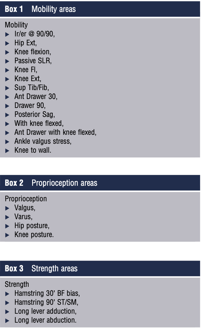 프리시즌에는 신체 전체를 평가합니다. 그러나 이 연구는 대부분의 부상이 하지에서 발생하기 때문에 하지에만 집중합니다. 하지 평가의 일환으로 가동성은 테스트는 14개 영역에서 측정되었습니다.(상자 1) 및 4개 영역의 고유수용성 감각 하지의 근력 비대칭은 4개 영역에서 측정되었습니다(상자 3 ). 4가지 강점 영역 각각에 대해 왼쪽대 오른쪽 비율을 취했습니다. 총 비대칭성은 4가지 비율의 합으로 계산되었습니다.
